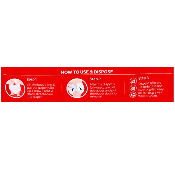 Lift the baby's legs and pull the diaper pant up. Follow 'Front' and 'Back' direction on the diaper.