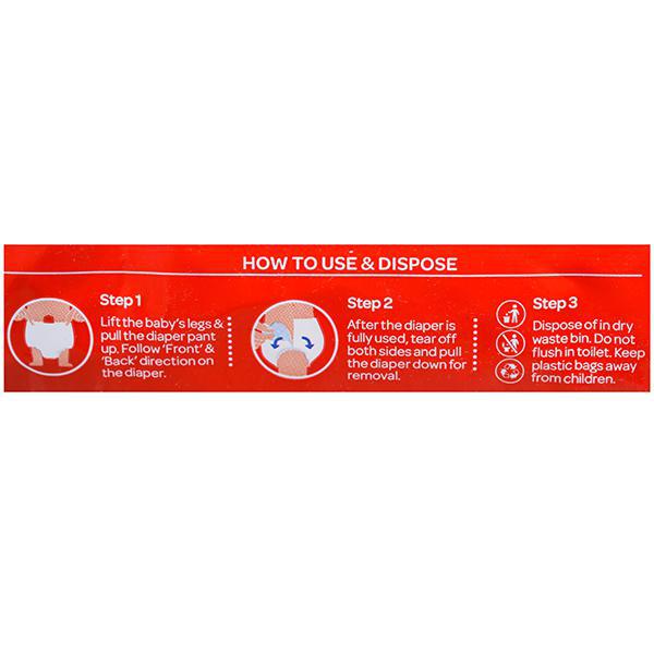 Lift the baby's legs and pull the diaper pant up. Follow 'Front' and 'Back' direction on the diaper.