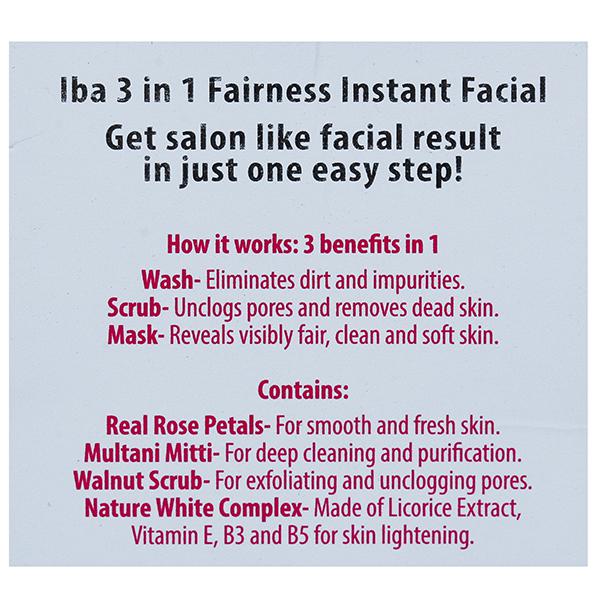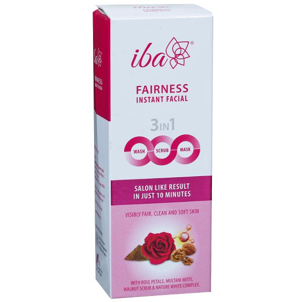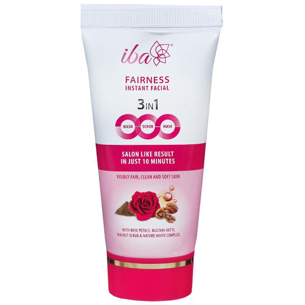 Iba Fairness Instant Facial 3 in 1 Wash Scrub Mask comes with Revolutionary Nature White Complex to give you a younger looking, brighter complexion in a matter of minutes. effectively washes away dirt, pollution and impurities, controls excess oil and ensures longer lasting fairness. Soap-free and gentle for daily use.