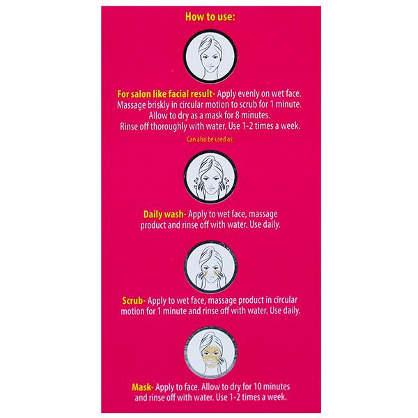 Apply on damp face avoiding the eye area and massage gently for 1 minute to remove skin impurities and tanning. Leave it on the skin for 5-10 minutes as a mask till it dries. Rinse thoroughly with water. For best results, use twice a week .
