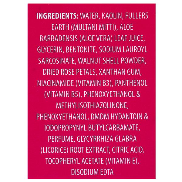 Walnut Shell Powder, Natural Clays, Rose, Nature White Complex, WATER, KAOLIN, MULTANI MITTI, ALOE BARBADENSIS (ALOE VERA) LEAF JUICE, GLYCERIN, BENTONITE, SODIUM LAUROYL SARCOSINATE, WALNUT SHELL POWDER, DRIED ROSE PETALS, XANTHAN GUM, PANTHENOL (VITAMIN B5), NIACINAMIDE (VITAMIN B3), PHENOXYETHANOL & METHYLISOTHIAZOLINONE, PHENOXYETHANOL, DMDM HYDANTOIN & IODOPROPYNYL BUTYLCARBAMATE, PERFUME, GLYCYRRHIZA GLABRA (LICORICE) ROOT EXTRACT, CITRIC ACID, DISODIUM EDTA, TOCOPHERYL ACETATE (VITAMIN E).