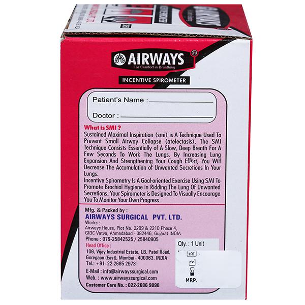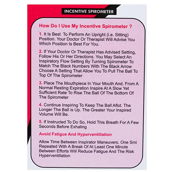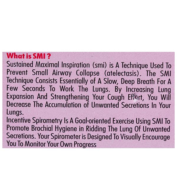 Incentive Spirometer (Airways) 1 Ball Device is a goal-oriented exercise using SMI (a technique used to prevent small airway collapse) to promote deep and prolonged inspiration. It helps patients' faster recovery post operatively gives good lung exercise helps better oxygenation. Incentive Spirometer (Airways) 1 Ball Device is designed to visually encourage you to monitor your own progress.