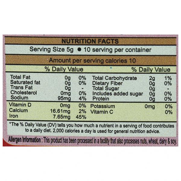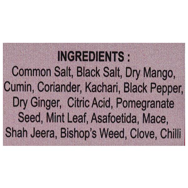 Asafoetida, Bishop, Weed, Bayleaf, Black salt, Black pepper, common salt, Citric Acid, Cumin, Coriander, Caraway, Clove, Dry Mango powder, Dry Ginger powder, Kachari, Mint leaf, Nutmeg, Pomegranate, Red chilli