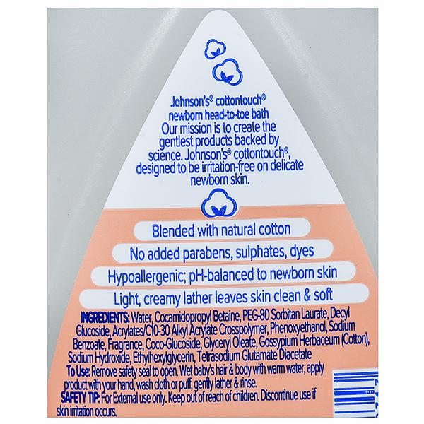 Product Information – Johnson's Baby Cottontouch Newborn Baby Head To Toe Baby bath with No More Tears technology designed for your newborn baby's sensitive skin. Designed to provide new babies with the gentle care their skin needs. It is perfectly pH-balanced to baby's sensitive skin, keeps newborn skin soft, healthy and irritation free. Ultra light formula is hypoallergenic, free from parabens, sulfates & dyes. Designed for zero irritation on a newborn's delicate skin. Fragrance, allergy free
