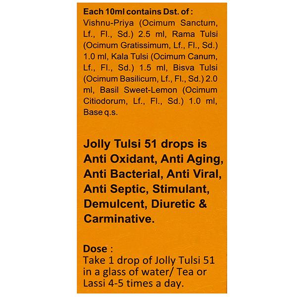 Jolly Tulsi 51 Drops is a formulation of Tulsi and other Herbal Ingredients which works wonderfully and supports immunity good health.