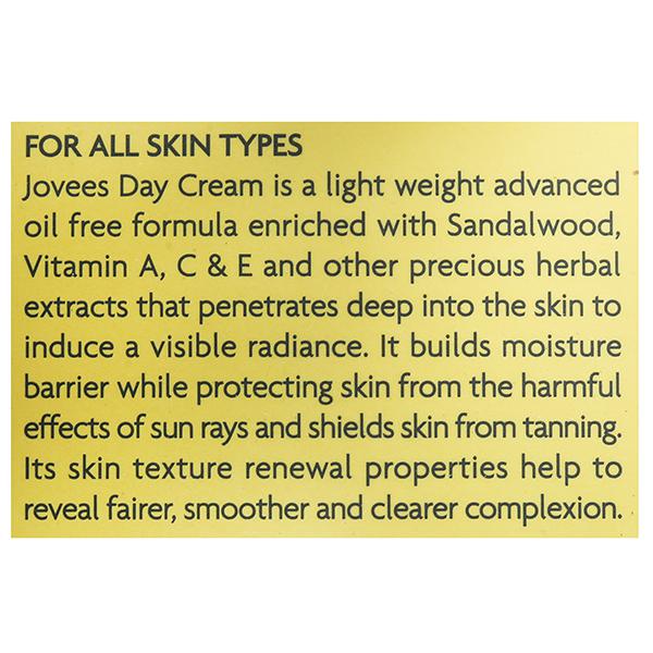 Jovees day cream is a lightweight advanced oil-free formula enriched with sandalwood, Vitamin A, C & E & other precious herbal extracts that penetrate deep into the skin to induce a visible radiance. It builds a moisture barrier while protecting skin from the harmful effects of sun rays & shields skin from tanning. Its skin texture renewal properties help to reveal a fairer, smoother & clearer complexion.