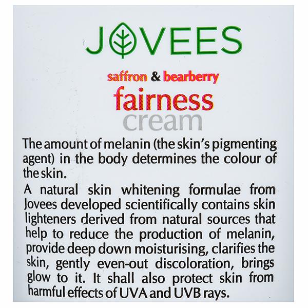 The amount of melanin the skin  pigmentation agent in the body determines the color of the skin. A natural skin whitening formula from Jovees developed scientifically contains skin lighteners derived from natural sources that help to reduce the production of melanin, provide deep down moisturizing, clarifies the skin, gently even out discoloration, brings a glow to it. It shall also protect skin from the harmful effects of UVA and UVB rays.
