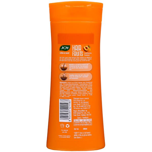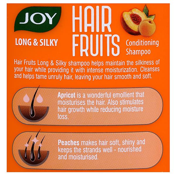 Product Information- Joy Hair Fruits Long & Silky shampoo helps maintain the silkiness of your hair while providing it with intense moisturization. Cleanses and helps unruly hair, leaving your hair smooth and soft.Apricot is a wonderful emollient that moisturises the hair. Also stimulates hair growth while reducing moisture loss.Peaches makes hair soft, shiny and keeps the strands well - nourished and moisturised.