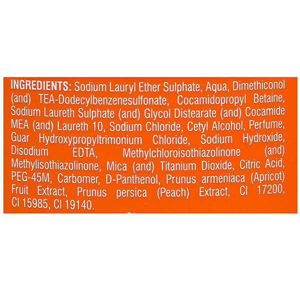 Aqua, Sodium Laureth Sulphate, Cocamidopropyl Betaine, Dimethiconol (and) TEA-Dodecylbenzenesulfonate, Guar Hydroxypropyltrimonium Chloride, D-Panthenol, Apricot Extract, Peach extract, Perfume
