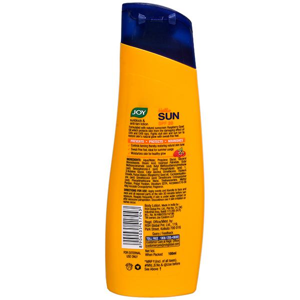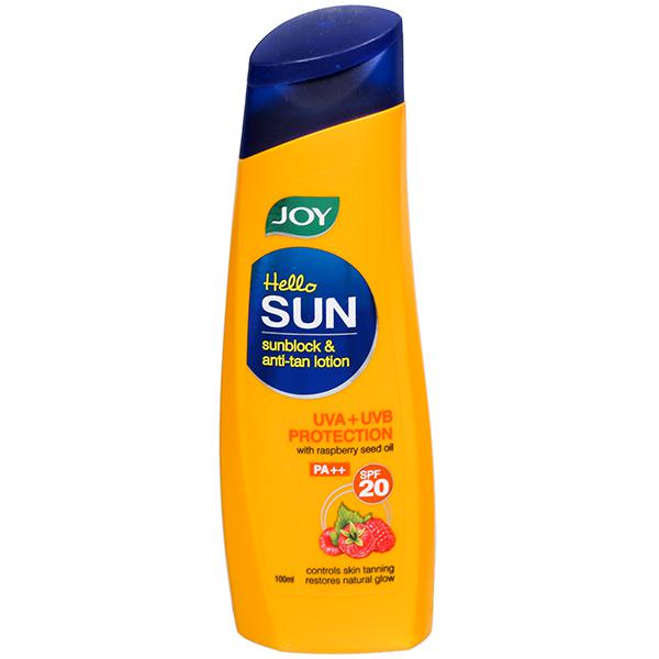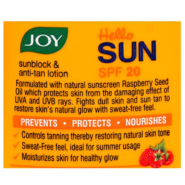Joy Hello Sun Sunblock & anti-tan lotion SPF is formulated with natural sunscreen Raspberry Seed Oil which protects skin from the damaging effect of UVA and UVB rays. It prevents skin darkening, sun tan and offers instant fairness with sweat-free feel. The Sunscreen Lotion provides more protection from sunburns.