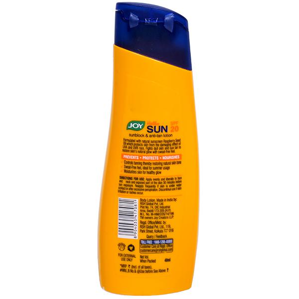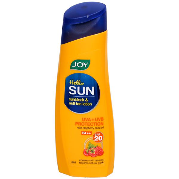 Joy Hello Sun Sunblock & anti-tan lotion SPF is formulated with natural sunscreen Raspberry Seed Oil which protects skin from the damaging effect of UVA and UVB rays. It prevents skin darkening, sun tan and offers instant fairness with sweat-free feel. The Sunscreen Lotion provides more protection from sunburns.