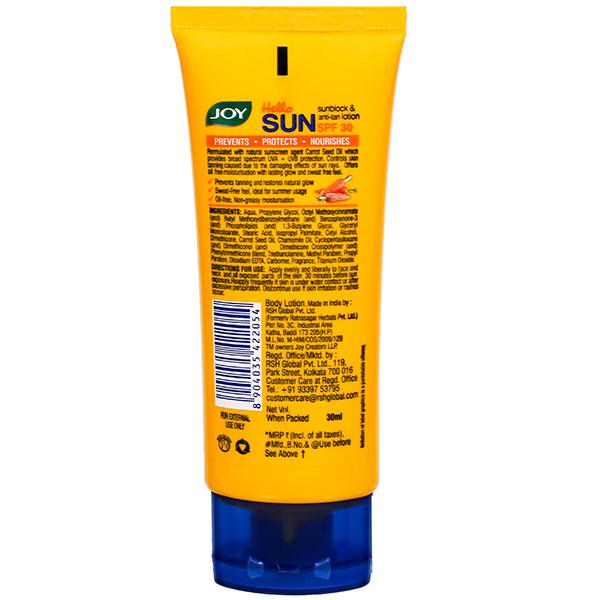 Joy Hello Sun Sunblock & anti-tan lotion SPF is formulated with natural sunscreen Raspberry Seed Oil which protects skin from the damaging effect of UVA and UVB rays. It prevents skin darkening, sun tan and offers instant fairness with sweat-free feel. The Sunscreen Lotion provides more protection from sunburns.