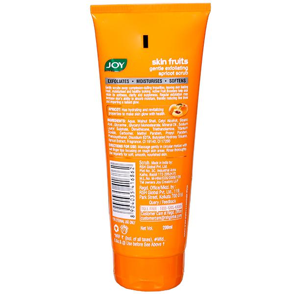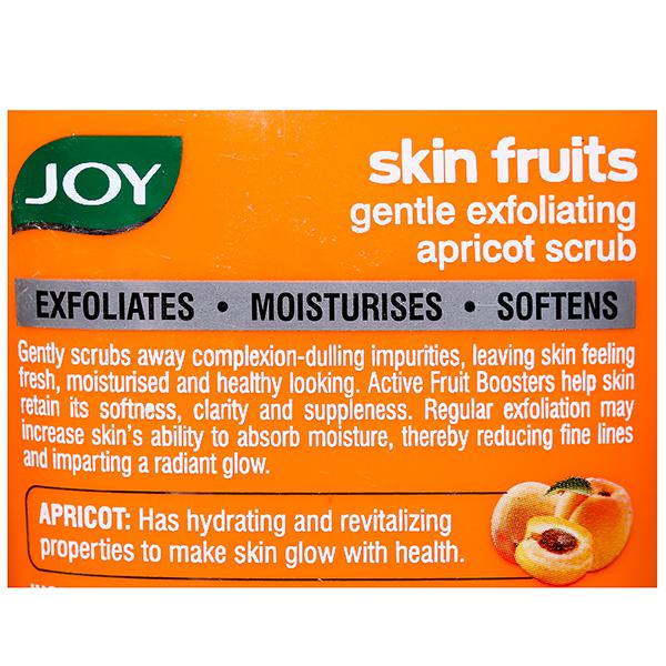 Joy skin fruits gentle exfoliating apricot scrub gently scrubs away complexion-dulling impurities, leaving skin feeling fresh, moisturised and healthy looking. Active fruit boosters help skin retain its softness, clarity and suppleness. Regular exfoliation increases skins ability to absorb moisture, thereby fighting fine lines and imparting a radiant glow.