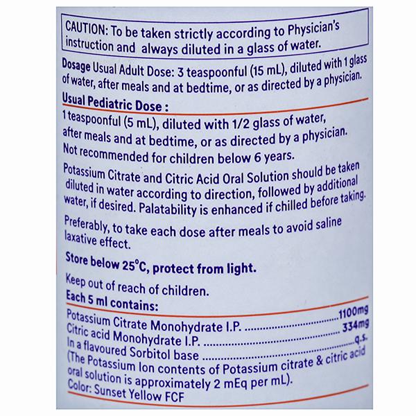 Each 5 ml of K Cit Syp contains Potassium Citrate Monohydrate 1100 mg, Citric Acid Monohydrate 334 mg in a flavoured Sorbitol Base q.s. (The Potassium Ion contents of Potassium citrate & citric acid oral solution is approximately 2mEq per ml).