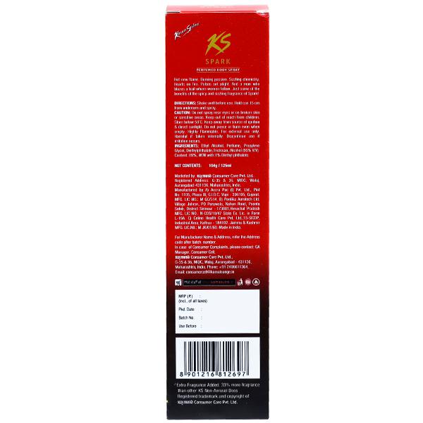 Product Information - KS is one of the leading brand of deodorants in India. It provides a wide range of exciting deodorants that has long lasting fragrance to make you feel fresh even at the end of the day. KS Spark Perfumed Body Spray is a non gas deodorant, with a spicy and sizzling fragrance that will make you stand out of the crowd. Spark Perfumed Body Spray is 33% more stronger, which creates an impact that cannot go unnoticed! The strong fragrance will help in enhancing your mood and boosts up your confidence giving you the relaxed feeling all day. Now you can enjoy the long-lasting freshness with our new range of Black deo. X, XX and XXX are non-gas deodorants with invigorating fragrances.