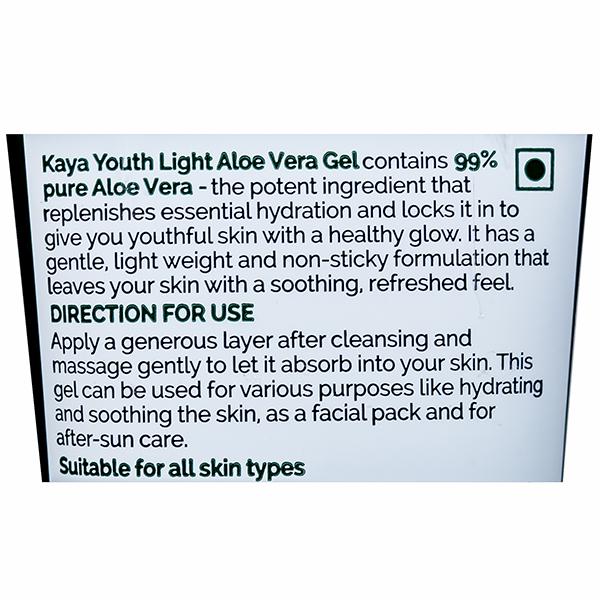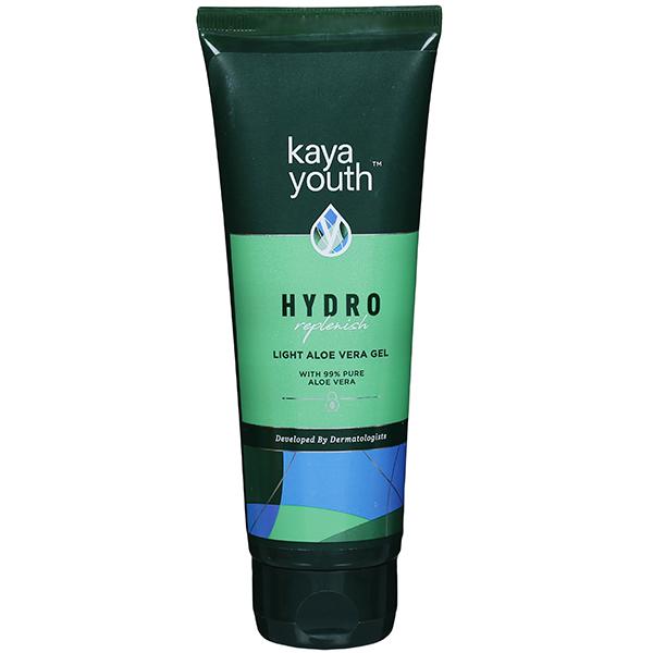 Kaya Youth Hydro Replenish Light Aloe Vera Gel for men and women contains 99% pure Aloe Vera - the potent ingredient intensely hydrates the skin and leaves it feeling refreshed, soft and glowing.Developed by dermatologists, it is enriched with an Aloe Hydro lock Complex that locks in hydration in the skin for 24 hours. Pure Aloe Vera face and body gel has a gentle, lightweight and non-sticky formulation and can be used for various purpose like hydrating and soothing the skin, as a facial pack for after-sun care.This pure Aloe Vera gel is paraben free, contains no harmful chemicals gets applied softly without any stickiness. Keep skin hydrated for all seasons. Now enjoy the freshness of Pure Aloe Vera gel all day long, infused with 24 hrs Hydro Lock. Try out the new Kaya Youth Hydro Replenish, light Aloe Vera Face and Body gel now!