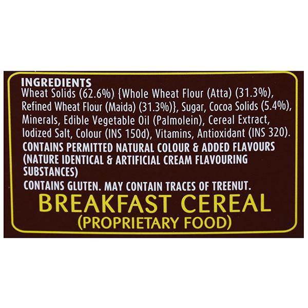 Ingredients:-Wheat Solids(62.6%) {Whole Wheat Flour(Atta) (31.3%), Refined Wheat Flour(Maida)(31.3%)}, Sugar, Cocoa Solids(5.4%), Minerals, Edible Vegetable Oil(Palmolein), Cereal Extract, Iodized Salt, Colour(INS 150d), Vitamins, Antioxidant(INS 320).