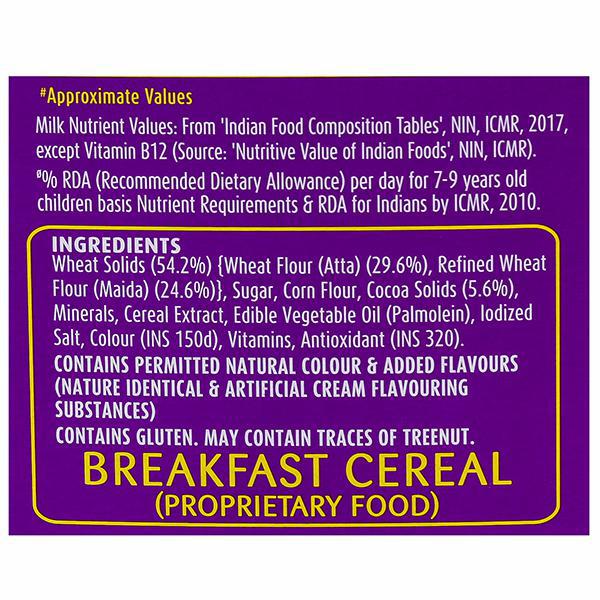 Ingredients:-Wheat Solids(62.6%) {Whole Wheat Flour(Atta) (31.3%), Refined Wheat Flour(Maida)(31.3%)}, Sugar, Cocoa Solids(5.4%), Minerals, Edible Vegetable Oil(Palmolein), Cereal Extract, Iodized Salt, Colour(INS 150d), Vitamins, Antioxidant(INS 320).