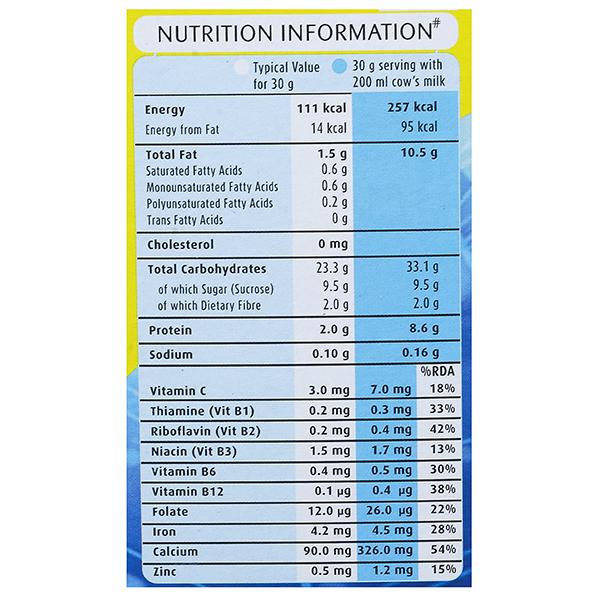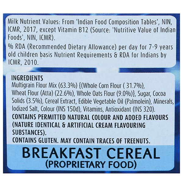 Ingredients:- Multi flour mix, Whole Corn Flour, Wheat Flour, Whole oats flour, sugar, Cocoa solids, Cereal Extract, Edible vegetable oil, Minerals, iodised salt, vitamins, anti- oxidant