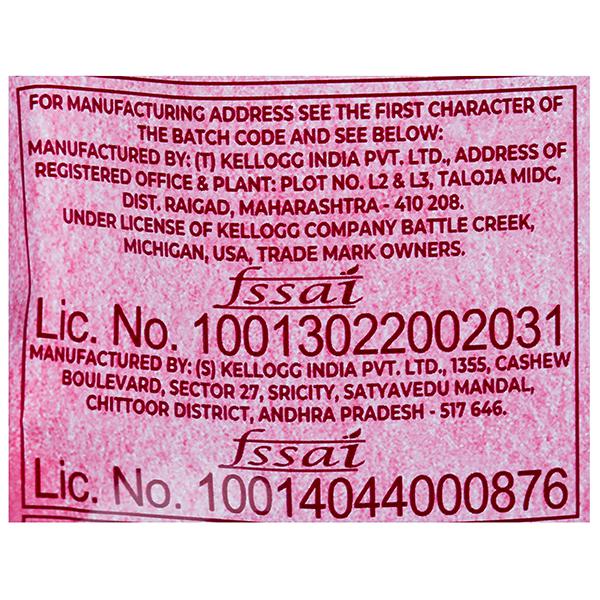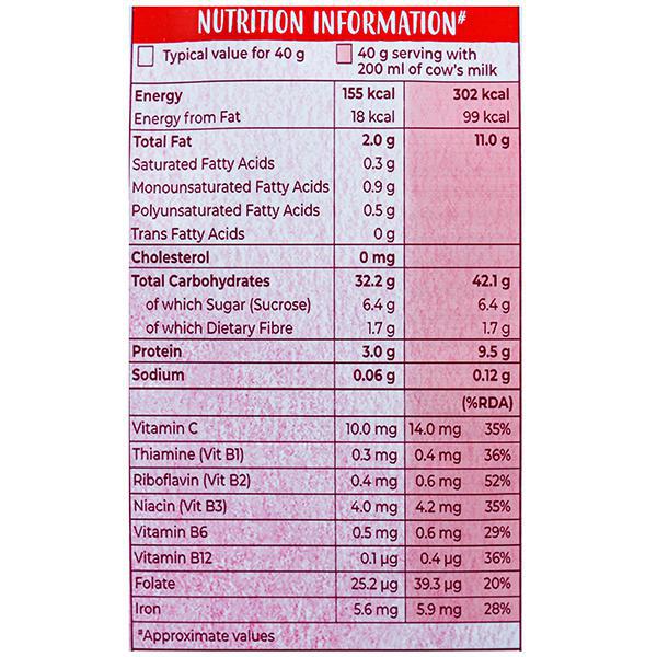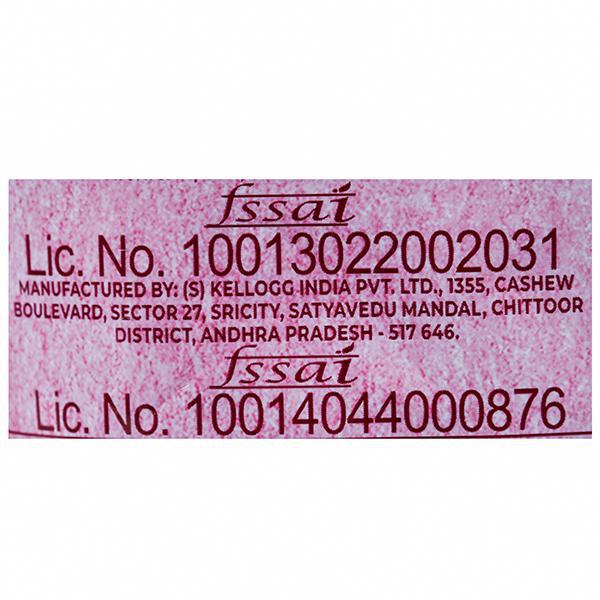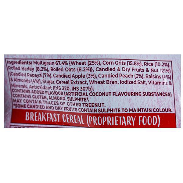 Multigrain 67.4%{Wheat(25%), Corn Grits(15.8%), Rice(10.2%), Rolled Barley(8.2%), Rolled Oats(8.2%)}, Candied and Dry Fruits & Nut(21%) (Candied Papaya(7%), Candied Apple(3%), Candied Peach(3%), Raisins(4%) & Almonds(4%)}, Sugar, Cereal Extract, Wheat Bran, Iodized Salt, Vitamins & Minerals, Antioxidant(INS 320, INS 307b).