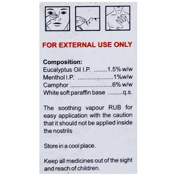 Eucalyptus Oil: 1.5% w/w, Menthol: 1% w/w, Camphor: 6% w/w, White soft paraffin base: q.s.