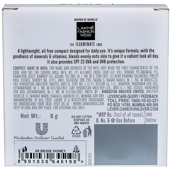 Product Information – Lakmé introduces the Lakmé Perfect Radiance Intense Whitening Compact, It gives your skin a matte finishing look and brightens your skin tone. Perfect Finishing Touch! This Lakmé Perfect Radiance Intense Whitening compact has a smooth texture that gives your skin a flawless finish and matte effect all day long, It feels soft on your skin and has a lightweight formula, This compact won’t clog pores and is ideal for everyday use Offers Sun Protection Infused with SPF 23 and UVA/UVB filters, this whitening compact shields your skin from the harmful and damaging sun’s rays. Powerful Ingredients, This Lakmé Ivory Fair compact is enriched with brightening pearls, vitamin B3 and multi-minerals to improve your skin tone. These ingredients whiten and soften your skin for naturally fairer-looking skin. This Lakmé whitening compact offers even and complete coverage It lasts long on your skin, eliminating the need for frequent touch-ups.