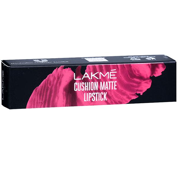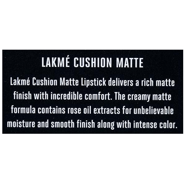 Lakmé Cushion Matte Lipstick. An exclusive new matte lipstick with a revolutionary soft matte formula that makes matte lips feel soft and comfortable. The soft matte formula is enriched with rose oil extracts from France which give your matte lips a moisturized, comfortable feel. It’s non-drying formula doesn’t dry your lips and leaves them feeling soft and looking intensely matte. Lakmé Cushion Matte is a water resistant soft matte lipstick that gives you a long lasting intense matte color and cushion soft lips all day. Choose from 20 vibrant matte shades and wear cushiony soft lips for a variety of occasions.How To Use :-