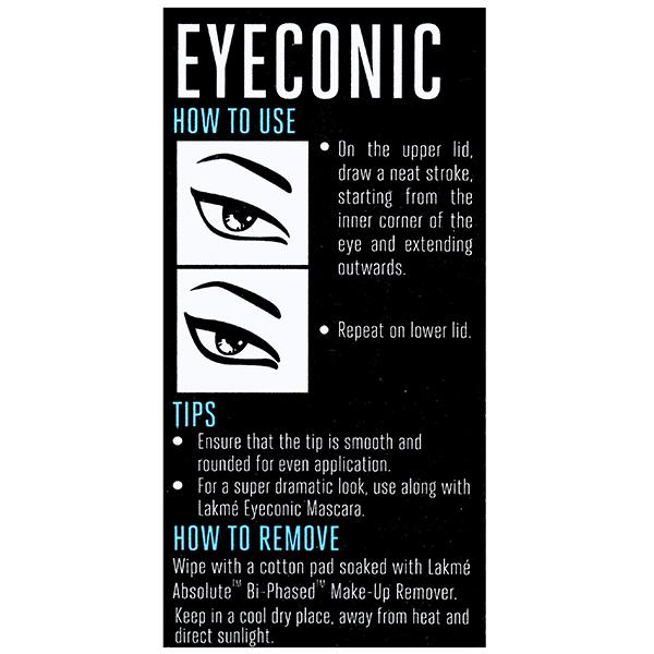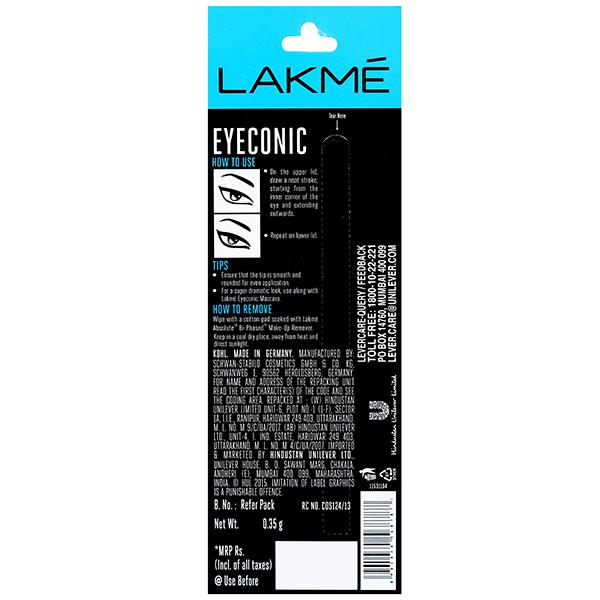 Product Information - Accentuate the beauty of your eyes with the lakmé eyeconic kajal. This dermatologically tested kajal is just what you need for completing your eye makeup or carrying a simple, only-kajal look. It's a smudge proof, water proof kajal and can add the dramatic and glamorous look to your eyes. It has intense matte texture for eyeconic eyes. You can experiment with a thin line or a bold wing, this kajal is great for day and night looks. Its long-lasting- up to 22 hours without smudging and is completely water proof.