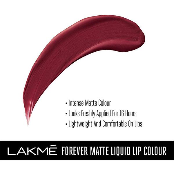 Introducing the New Lakme Forever Matte Lip Color Range - Available in 30 Exciting shades! Designed by experts, this lip color has an intense matte payoff that lasts long and looks freshly applied for up to 16 hrs. These deeply pigmented shades provide your lips with long lasting colors that just don’t budge! Whilst the color payoff is intense the texture is lightweight and very comfortable on the lips! Easy to apply, it glides on effortlessly and stays forever fresh!How To Apply - Start by defining your Cupid's Bow to get perfectly designed lips. Then, move to the outer edges and get an intense look in one swipe. Get the intense matte payoff that looks fresh for up to 16 hours.