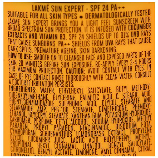 Product Information - Get the best protection for your skin from the harsh sun rays with the Lakme sun expert. It has been specially formulated to protect you from the negative effects of the sun, like sunburn, premature aging and dark spots.