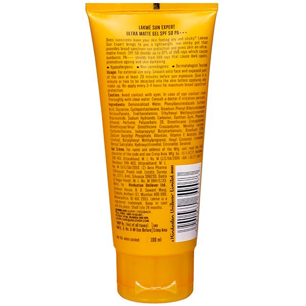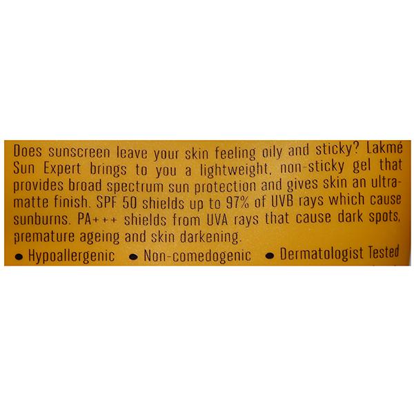 Product Information - Stepping out without sun protection?? You think your scarf is enough?? Think again - it takes just 7 minutes for the sun to start damaging your skin in this hot indian weather. Choose Lakme Sun Expert - your daily sunscreen which is light enough to be used all year round. It contains cucumber, lemongrass, Vitamin B3 and has been tested by dermatologists. Suitable for all skin types - this lightweight gel provides broad spectrum UV protection. SPF 50 blocks upto 97% harmful rays of UVB which causes tanning & sunburns. The PA++ shields your skin from UVA rays which cause dark spots, premature ageing and skin darkening. It helps prevent tan lines that appear on the skin due to harmful sun rays.