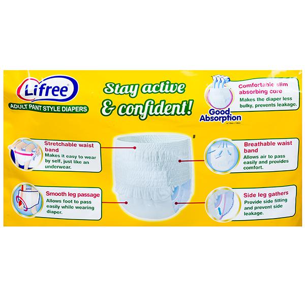Lifree adult pant style diapers are easy to use by oneself. Just like an underwear it can be easily pulled up and removed. These diapers are light and comfortable and have good fit preventing leakage. It helps you to stay active be outgoing with confidence.