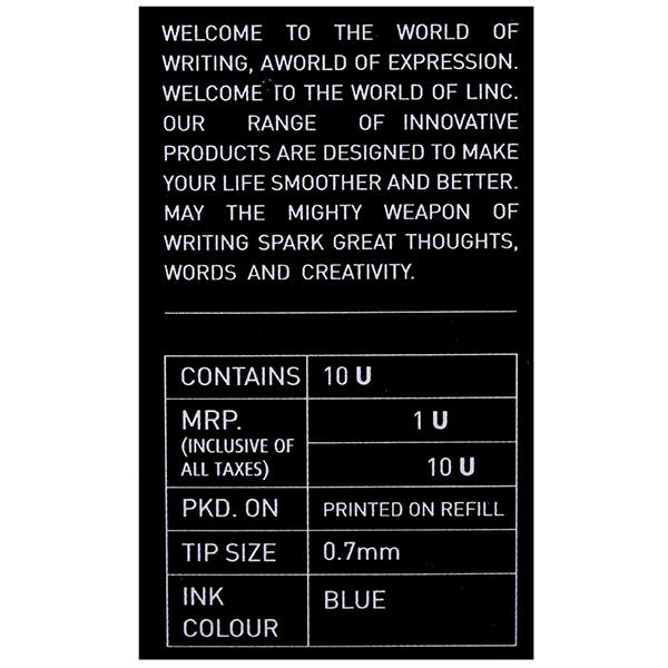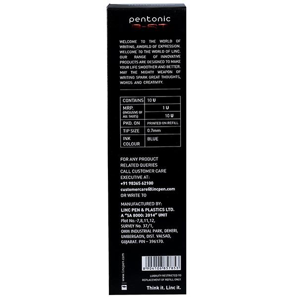 Product Information- Welcome to the world of writing, a world of expression. Welcome to the world of Linc. Our range of innovative products are designed to make your life smoother and better. PENTONIC is the newest addition into our wide range of mighty weapon. Linc Pentonic B-RT Blue Ball Pen Refill Pack Of 10