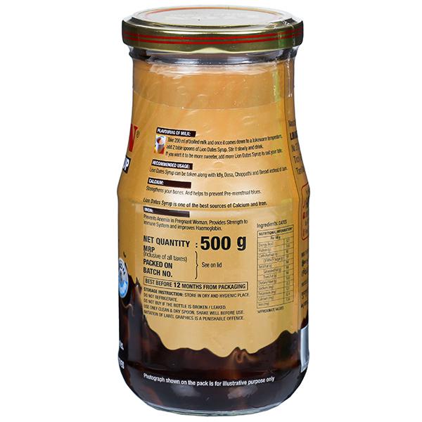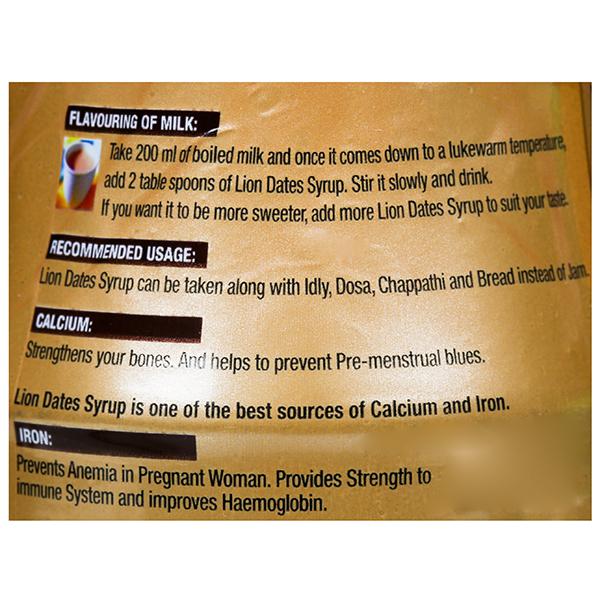 Product Information: Lion Dates Syrup Is One Of The Best Sources Of Calcium And Iron. Flavoring Of Milk: Take 200 Ml Of Boiled Milk And Once It Comes Down To A Lukewarm Temperature, Add 2 Table Spoons Of Lion Dates Syrup. Stir It Slowly And Drink. If You Want It To Be More Sweeter Add More Lion Dates Syrup To Suit Your Taste. Lion Dates Syrup Can Be Taken Along With Idly, Dosa, Idiyappam, Chappathi And Bread Instead Of Jam.