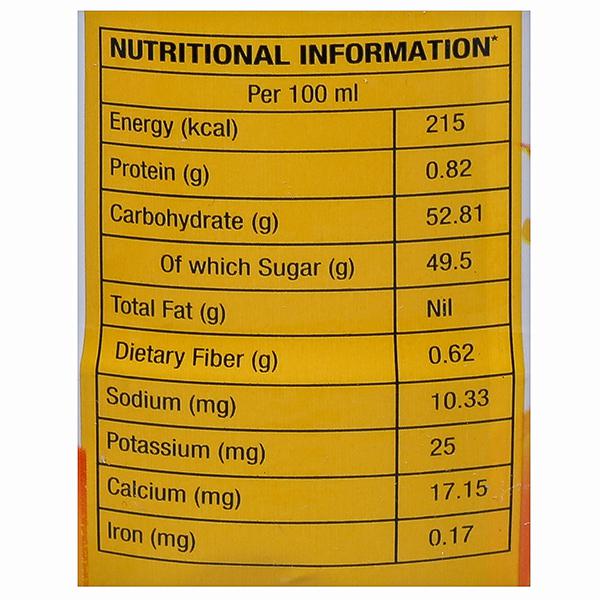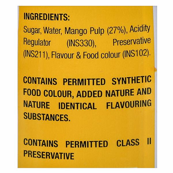 Ingredients - Sugar, Water,Mango Pulp, Acidity regulator (INS330), Class II preservatives (INS211), Colour (INS102) Contains Permitted Synthetic Food Colour and added Flavour Nature Identical Flavouring Substanced (CONTAINS PERMITTED CLASS II PRESERVATIVE)