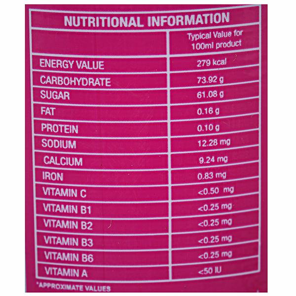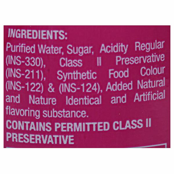 Ingredients - Puried Water, Acidity Regulator (Ins330), Class II Preservative (Ins211) synthetic food colour (INS-122) (ins-124). Added Natural and Nature Identical and Artificial flavouring substances. (CONTAINS PERMITTED CLASS II PRESERVATIVE)