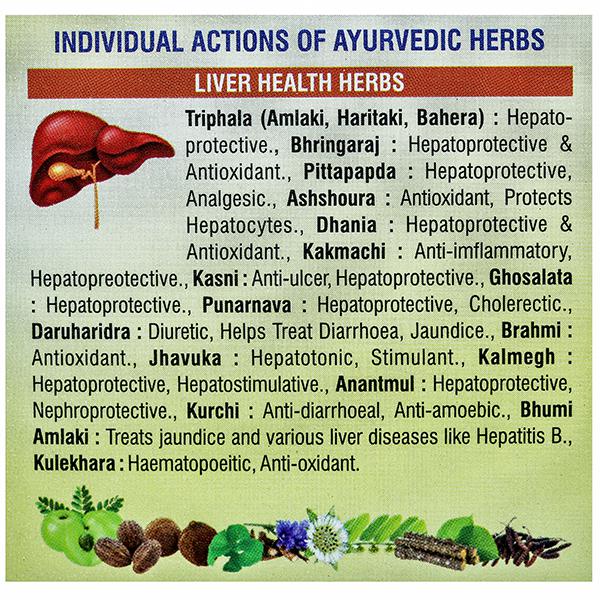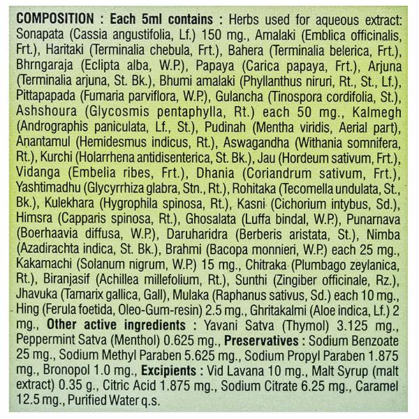 Sonapata (Cassia angustifolia, Lf.) 150 mg., Amalaki (Emblica officinalis, Frt), Haritaki (Terminalia chebula, Frt.), Bahera (Terminalia belerica, Frt.), Bhrngaraja (Eclipta alba, W.P.), Papaya (Carica papaya, Frt.), Arjuna (Terminalia arjuna, St. Bk.), Bhumi amalaki (Phyllanthus niruri, Rt., St., Lf.), Pittapapada (Fumaria parviflora, W.P.), Gulancha (Tinospora cordifolia, St.), Ashshoura (Glycosmis pentaphylla, Rt.) each 50 mg., Kalmegh (Andrographis paniculata, Lf., St.), Pudinah (Mentha viridis, Aerial part), Anantamul (Hemidesmus indicus, Rt.), Aswagandha (Withania somnifera, Rt.), Kurchi (Holarrhena antidisenterica, St. Bk.), Jau (Hordeum sativum, Frt.), Vidanga (Embelia ribes, Frt.), Dhania (Coriandrum sativum, Frt.), Yashtimadhu (Glycyrrhiza glabra, Stn., Rt.), Rohitaka (Tecomella undulata, St., Bk.), Kulekhara (Hygrophila spinosa, Rt.), Kasni (Cichorium intybus, Sd.), Himsra (Capparis spinosa, Rt.), Ghosalata (Luffa bindal, W.P.), Punarnava (Boerhaavia diffusa, W.P.), Daruharidra (Berberis aristata, St.), Nimba (Azadirachta indica, St. Bk.), Brahmi (Bacopa monnieri, W.P) each 25 mg., Kakamachi (Solanum nigrurn, W.P.) 15 mg., Chitraka (Plumbago zeylanica, Rt.), Biranjasif (Achillea millefolium, Rt.), Sunthi (Zingiber officinale, Rz.), Jhavuka (Tamarix gallica, Gall), Mulaka (Raphanus sativus, Sd.) each 10 mg., Hing (Ferula foetida, Oleo-Gum-resin) 2.5 mg., Ghritakalmi (Aloe indica, Lf.) 2 mg.,