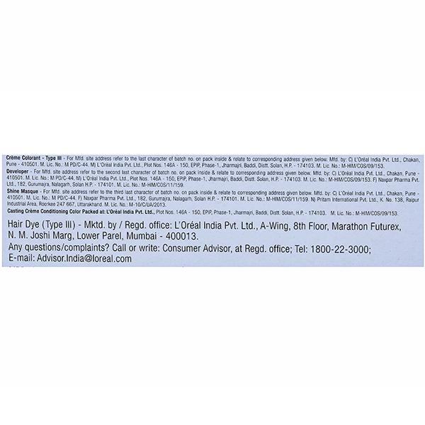 Get that glossy shine on your hair with this Casting Creme Gloss hair color from Loreal Paris. This Creme Gloss hair color gives your hair a luxurious treat, leaving a unique shine. The Loreal Paris Casting Creme Gloss hair color is perfect for women. Also, this darkest brown - 300 color provides the perfect coverage. Besides covering your grey strands, this Casting Creme Gloss hair color gives you an even application. This Loreal Paris Casting Creme hair color leaves a natural color on your hair and rewards you with a stunning look.