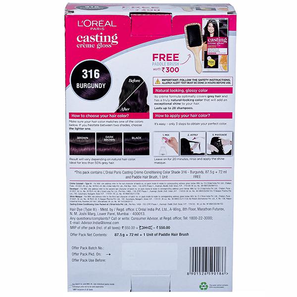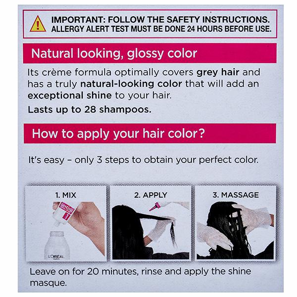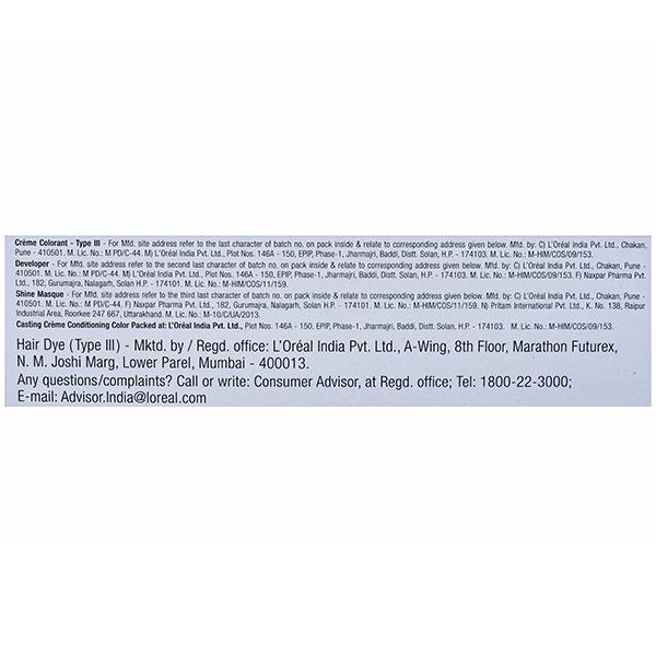 A new generation of No-Ammonia Color that gives you gorgeous looking hair! The new L'Oreal Paris Casting Creme Gloss is now 4X glossier. The non-ammonia conditioning hair colour covers greys, giving natural-looking colour, visible shimmering tones and ultra 4X glossy shine. A total beauty treatment for your hair that lasts up to 28 shampoos and gives intense nutrition for healthy, satin soft and voluminous hair. The non-drip crème formula provides easy and clean application in just 20 minutes, suitable even for beginners. The delicate fragrance makes colouring a luxurious treat. In this pack you will find: one tube of no-ammonia crème colorant, one bottle of developed cream, one bottle of new glossy crème conditioner and one pair of gloves. Give your hair a total beauty treatment with Casting Crème Gloss : No ammonia. Glossy shine. Natural looking color. Color lasts up to 28 shampoos. Covers Grey. Delicate fragrance. Non-permanent. Glossy and natural looking color in just 20 minutes.