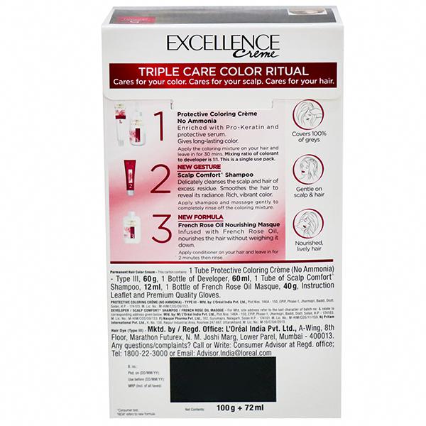 Get 100% grey coverage from root to tip with Loreal Paris Excellence Cream Triple Care Colour.