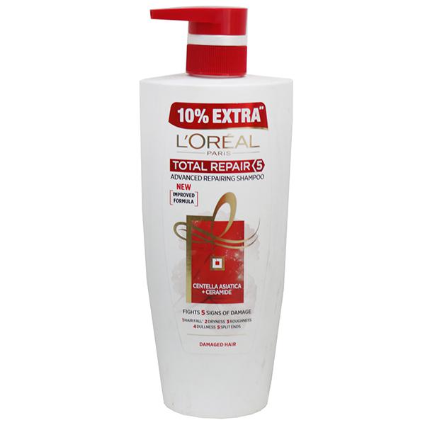This is the rich in ceramides which go deep into hair and act at the cellular level. The formula repair 5 signs of damage as ceramide is replica of hair cement, is known to fill external cracks making hair smooth. It protects hair from heat, humidity, excessive brushing and blow drying and other styling tools. L'Oreal Paris Total Repair 5 Advanced Repairing Shampoo is enriched with ceramide-cement formula. It helps resolve five signs of hair damage – hair fall, roughness, dryness, dullness, and split ends. It has a pleasant smell and does not dry out the scalp. The shampoo comes in an upside-down white bottle that has a red open flip lid. Shampoo for damaged hair. With Protein + Ceramide. Fights the 5 signs of damage. L’Oréal Paris Total Repair 5 shampoo helps repair the five visible signs of damaged hair - Split Ends, Weak, Rough, Dull and Dehydrated. The results? 1) Rebuilt fibers 2) Strength 3) Vitality 4) Silkiness and 5) Shine. Our strengthening system with Protein + Ceramide helps fortify each strand, reinforcing hair fiber and sealing-in nourishment. Enriched with the goodness of almond, wheat germ and jojoba oil.