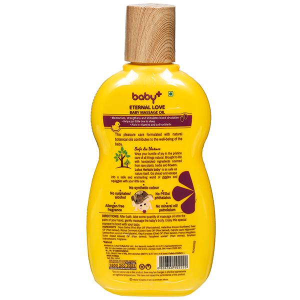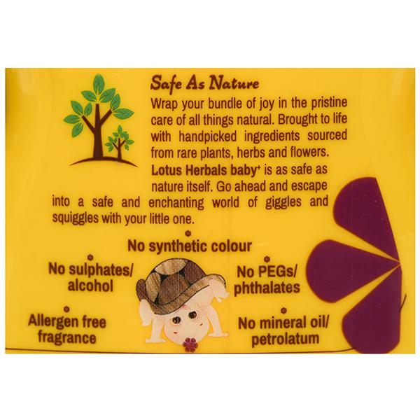 This pleasure care formulated with natural botanical oils contributes to the well-being of the baby.SAFE AS NATURE Wrap your bundle of joy in the pristine care of all things natural. Brought to life with handpicked ingredients sourced from rare plants, herbs and flowers. Lotus Herbals baby+ is as safe as nature itself. Go ahead and escape into a safe and enchanting world of giggles and squiggles with your little one. Additional information - No sulphate/alcohol - No synthetic colour and fragrances - No PEGs/phthalates - No mineral oil/petrolatum - No preservatives core deliveries - Moisturises and strengthens and stimulates blood circulation - Help put little one to sleep - Rich in vitamins & anti- oxidants