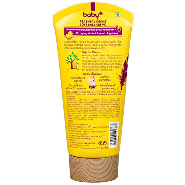 Lotus baby+ Crème soothes dry, delicate skin. This formula absorbs quickly and is gentle enough for infants and babies with sensitive skin.SAFE AS NATURE Wrap your bundle of joy in the pristine care of all things natural. Brought to life with handpicked ingredients sourced from rare plants, herbs and flowers. Lotus Herbals baby+ is as safe as nature itself. Go ahead and escape into a safe and enchanting world of giggles and squiggles with your little one . Additional information - No sulphate/alcohol - No synthetic colour and fragrances - No PEGs/phthalates - No mineral oil/petrolatum - No preservatives core deliveries - Intensive moisturising to prevent dryness - No drying alcohol & won't clog pores