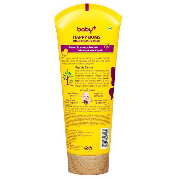 This unique natural formula helps to appease delicate baby skin, blend of calendula extracts and zinc oxide protects from the causes of nappy rash.SAFE AS NATURE Wrap your bundle of joy in the pristine care of all things natural. Brought to life with handpicked ingredients sourced from rare plants, herbs and flowers. Lotus Herbals baby+ is as safe as nature itself. Go ahead and escape into a safe and enchanting world of giggles and squiggles with your little one. Additional information - No sulphate/alcohol - No synthetic colour and fragrances - No PEGs/phthalates - No mineral oil/petrolatum - No preservatives core deliveries - Reduces the severity of diaper rash - Helps prevent bacterial growth