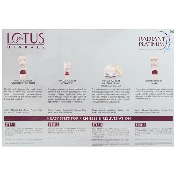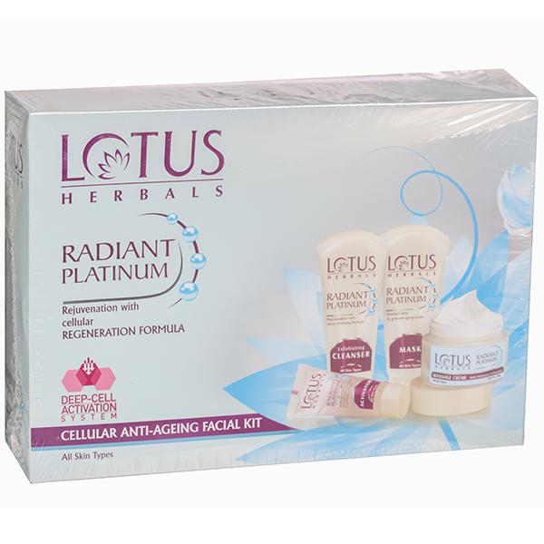 Lotus herbal introduces its top notch RADIANT PLATINUM Cellular Anti-Ageing 1 FACIAL KIT, which is a single use facial kit and comes in a sachet that includes Radiant Platinum Exfoliating Cleanser, Radiant Platinum activator, Radiant Platinum Massage Creme and Radiant Platinum Mask, which give you a tantalizing glow with a dreamy softness.