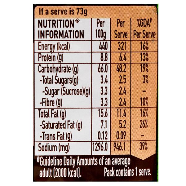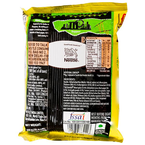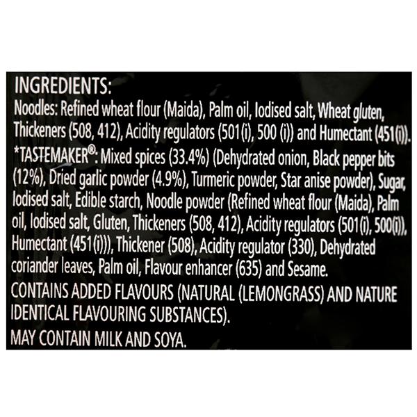 *Tastemaker: Mixed spices (33.4%) (Dehydrated onion, Black pepper bits (12%), Dried garlic powder (4.9%), Turmeric powder, Star anise powder), Sugar, Iodised salt, Edible starch, Noodle powder (Refined wheat flour (Maida), Palm oil, Iodised salt, Gluten, Thickeners (508, 412), Acidity regulators (501(i), 500(i)), Humectant (451(i))), Thickener (508), Acidity regulator (330), Dehydrated coriander leaves, Palm oil, Flavour enhancer (635) and Sesame. CONTAINS ADDED FLAVOURS (NATURAL (LEMONGRASS) AND NATURE IDENTICAL (GREEN CHILLI) FLAVOURING SUBSTANCES) MAY CONTAIN MILK AND SOYA.