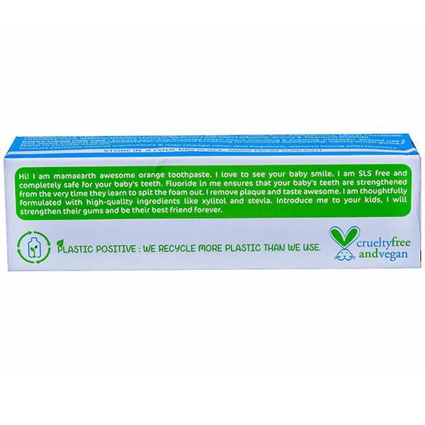 I am Mamaearth's awesome orange toothpaste. I love to see your baby smile. I am SLS free and completely safe for your baby’s teeth. Fluoride in me ensures that your baby’s teeth are strengthened from the very time they learn to spit the foam out. I remove plaque and taste awesome. I am thoughtfully formulated with high-quality ingredients like Xylitol and Stevia. Introduce me to your kids, I will strengthen their gums and be their best friend forever.