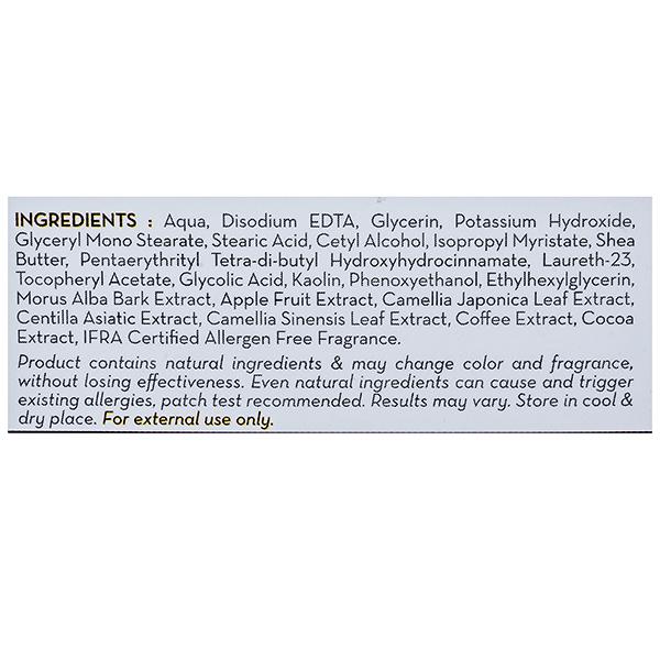 Full ingredient list: Aqua, Disodium EDTA, Glycerin, Potassium Hydroxide, Glyceryl Mono Stearate, Stearic Acid, Cetyl Alcohol, Isopropyl Myristate, Shea Butter, Pentaerythrityl Tetra-di-butyl Hydroxyhydrocinnamate, Laureth-23, Tocopheryl Acetate, Glycolic Acid, Kaolin, Phenoxyethanol, Ethylhexylglycerin, Morus Alba Bark Extract, Pyrus, Apple Fruit Extract, Camellia, Japonica Leaf Extract, Centella Asiatica Extract, Sinensis, Coffee Extract, Cocoa Extract, IFRA Certified Allergen Free Fragrance
