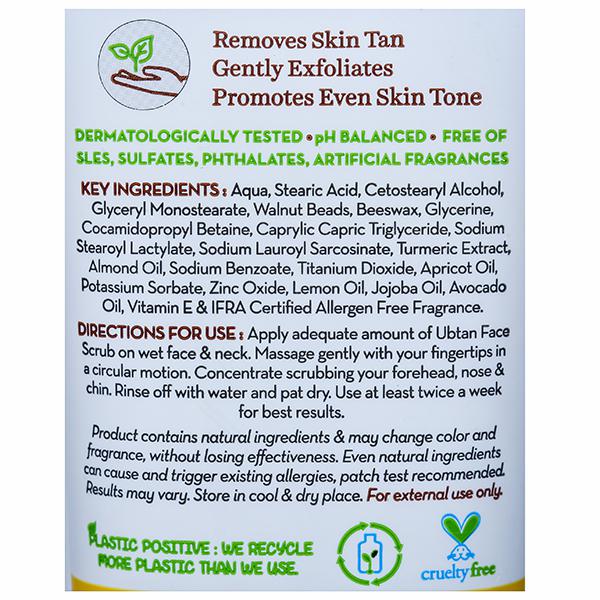 Product Information - Pollution, dirt, harmful UV rays, and harsh weather conditions can damage your skin over time. They make your skin look dull, tanned and give it an uneven skin tone. To avoid these, your skin needs an effective but gentle scrub that fights these harmful effects and gives you flawless skin. Mamaearth Ubtan Face Scrub, enriched with the natural goodness of turmeric and walnut, is just the thing you need! Antioxidants in turmeric protect skin from free radical damage. It's also traditionally known to fight sun tan and lighten skin tone. Walnut in the scrub gently exfoliates to reveal fresh and healthy skin. Dermatologically tested, this scrub is suitable for all skin types. It contains no harmful chemicals.
