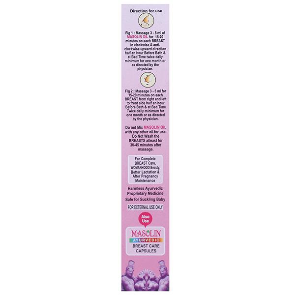 Product Information - Masolin Herbal breast massage oil is a multi-purpose treatment that helps women regain their lost confidence, especially after pregnancy. Its unique 5 action formula helps maintain breast size and shape, reduce stretch marks, remove cracks in heels and nipples, make the breast firm and brighten the skin. After pregnancy, regular massage with Masolin oil brings back the lost firmness, while also reducing stretch marks. Moreover, it lowers abdominal pain and aids in better lactation after pregnancy. It comprises of ancient and valuable herbs that have been carefully selected to provide the best possible results. Herbal MASOLIN Multipurpose BREAST Care products are manufactured with utmost care under the strict supervision of qualified & experienced technical personnel. They are GMP certified. For best results use both Masolin oil and capsule daily. Massage the oil on the breasts gently in circular and anti-circular motion.